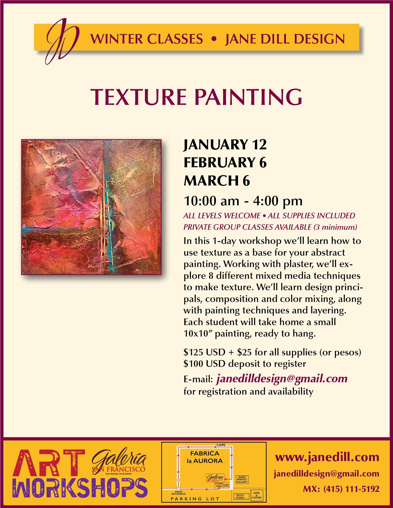 Classes are held at the Art Workshop space at the Galeria San Francisco at the Fabrica Aurora Design Center in San Miguel de Allende, MX.